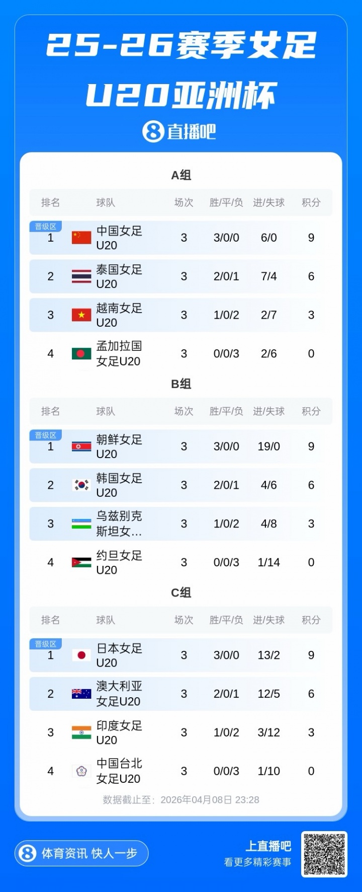 04月08日讯 U20女足亚洲杯结束全部小组赛的较量,最终A组头名出线的中国女足U20将在1/4决赛对阵乌兹别克斯坦U20女足。比赛于4月11日21点开球。...